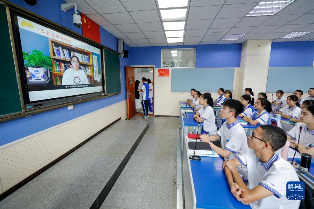 在成都七中东方闻道网校高2024届开学典礼上,参加该网校学习的四川省凉山彝族自治州雷波中学高2023届学生吉吉金巫通过视频向学弟学妹们讲述自己在网校学习的收获(9月1日摄)。新华社记者 沈伯韩 摄