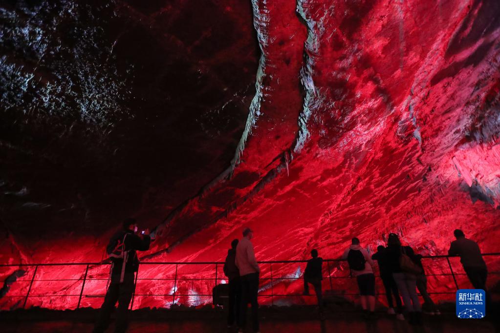 9月4日,游客在比利时那慕尔省莱斯河畔昂村的汉溶洞内体验声光秀。