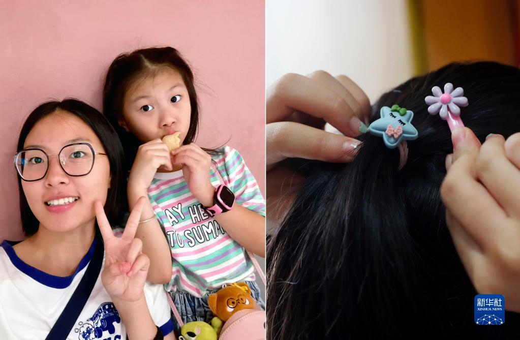 拼版照片:左图许若橦和7岁的妹妹的合影(受访者提供);右图为华东师范大学光华书院的新生、来自福建福州的许若橦用离家时妹妹送给自己的发圈和小发夹扎头发(9月4日新华社记者刘颖摄)。