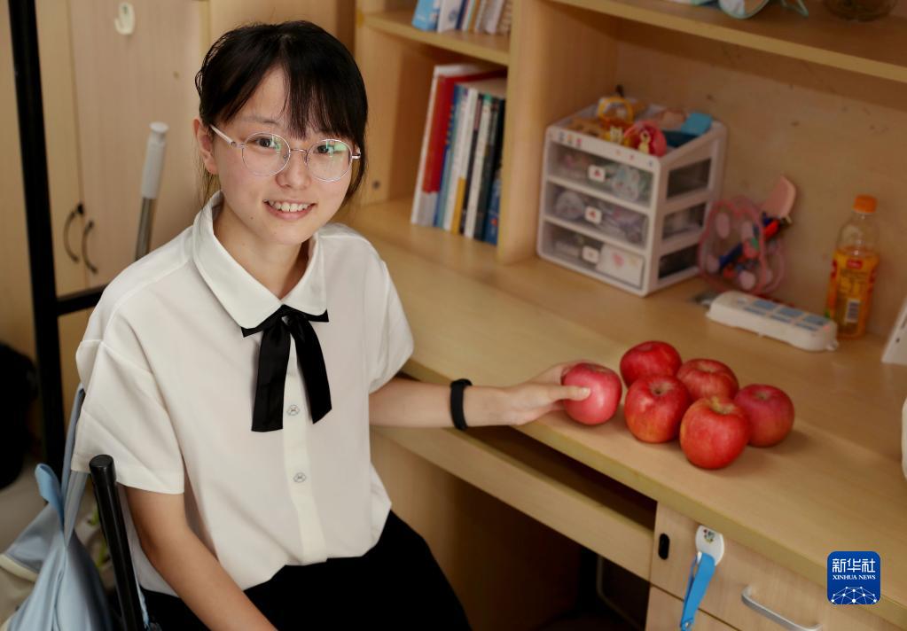 华东师范大学大夏书院的新生、来自四川绵阳的杨慧杰展示离家时外婆塞在自己行李箱的6个苹果(9月4日摄)。