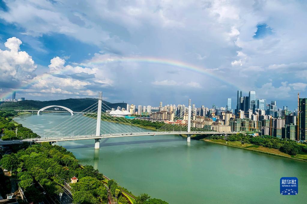 9月5日,阵雨过后,南宁上空出现彩虹,景色如画。