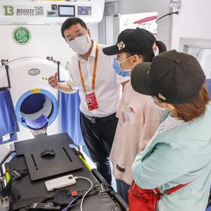 9月5日,工作人员在服贸会首钢园区健康卫生服务专题展上介绍5G移动卒中单元。5G移动卒中单元是将移动CT和相关检验仪器装配在救护车上,在5G网络下形成集神经症状检查、CT诊断和静脉溶栓治疗为一体的救治单元。