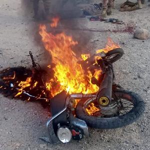 这是9月5日在巴基斯坦奎达自杀式爆炸袭击现场拍摄的起火的摩托车。