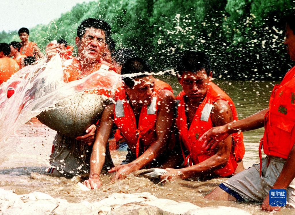 这是河北武警战士在长江大堤上抢险(1998年8月16日摄)。