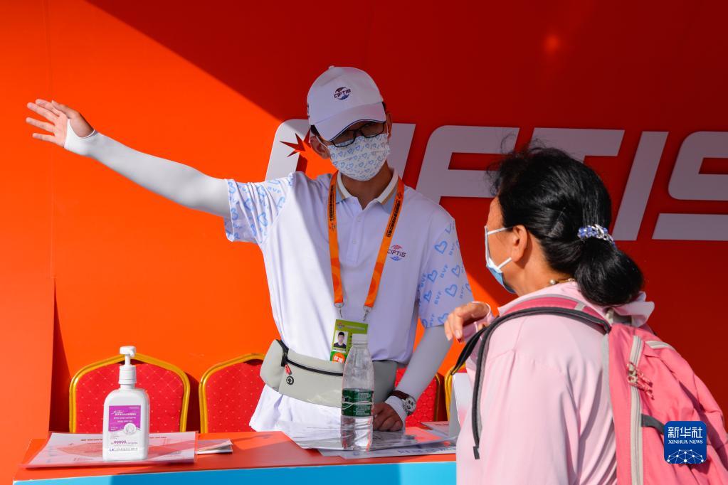 9月6日,志愿者(左)在服贸会首钢园区为观众指路。