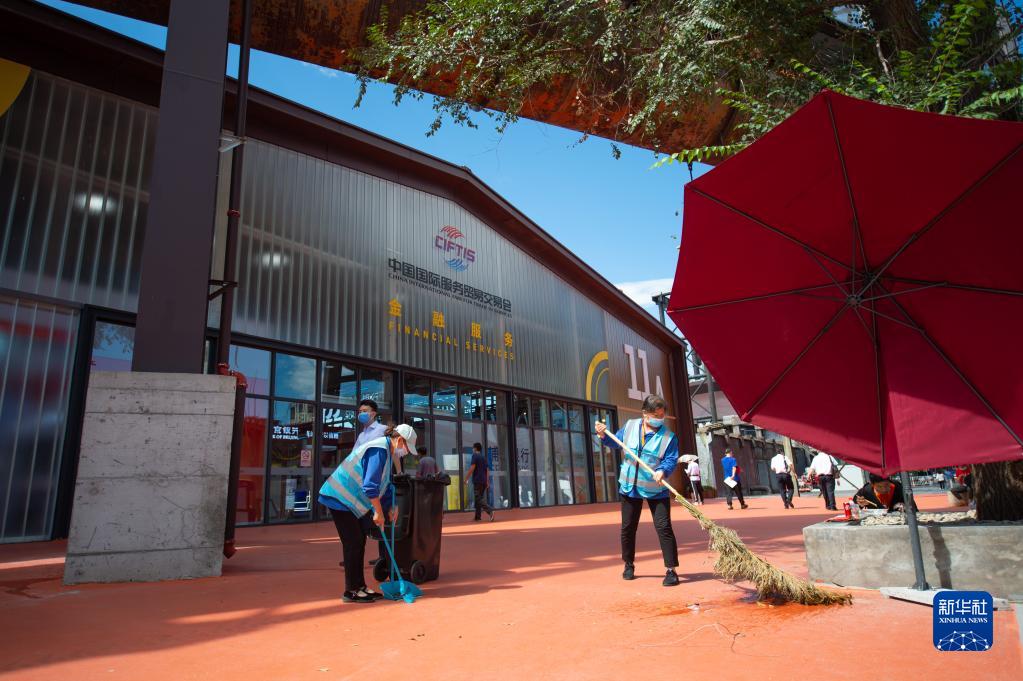 9月6日,保洁员在服贸会首钢园区金融服务展馆前清扫地面。