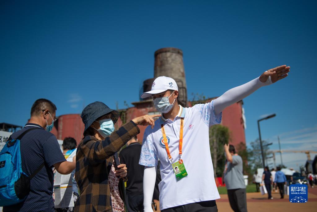 9月6日,志愿者韩青东在服贸会首钢园区为观众指引方向。