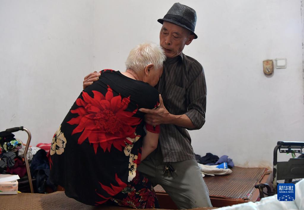 在江西省南昌县三江镇徐罗村,罗安民将老伴抱上轮椅。每天完成这项活动他都要花费二十分钟(9月5日摄)。