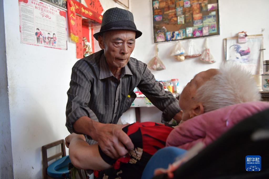 在江西省南昌县三江镇徐罗村,罗安民准备推老伴外出晒太阳(9月5日摄)。