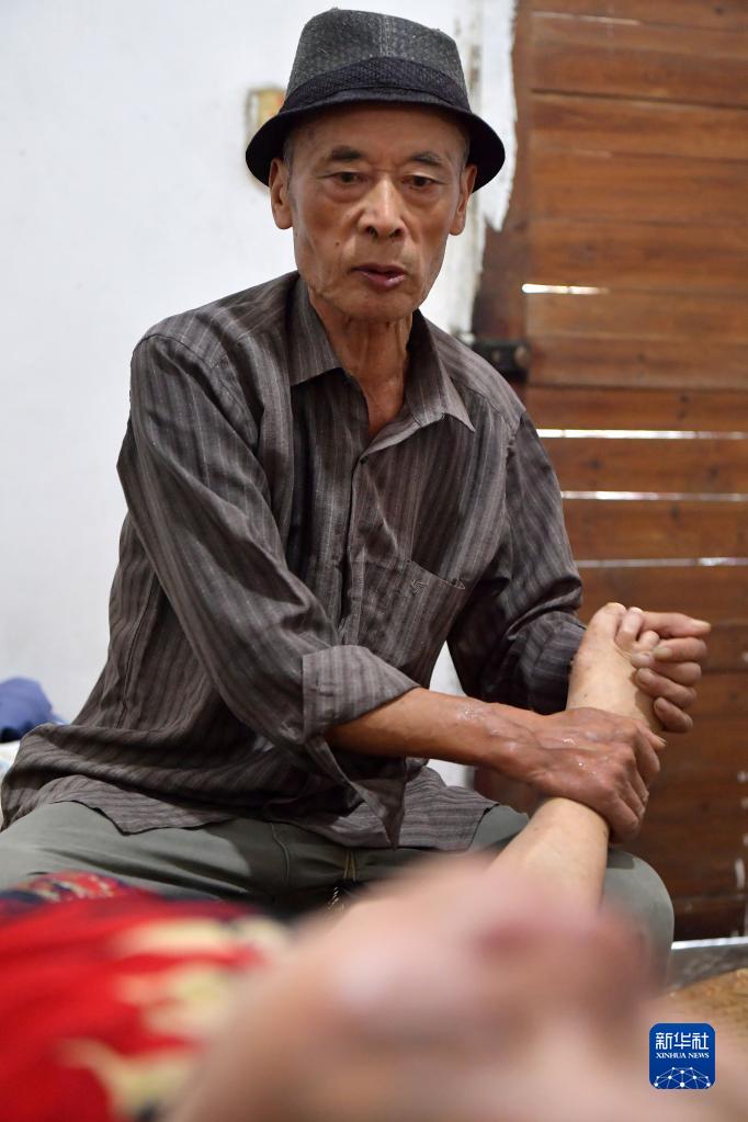 在江西省南昌县三江镇徐罗村,罗安民给老伴按摩(9月5日摄)。