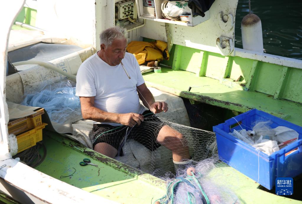 9月6日,在法国马赛老港的鱼市,一名渔夫在船上织渔网。