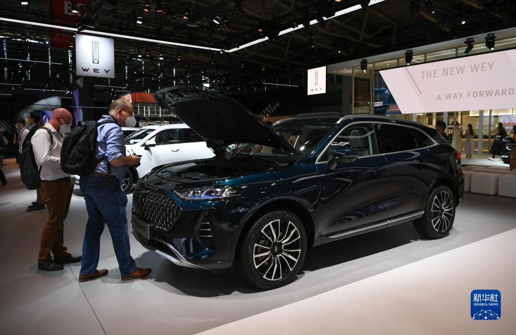9月6日,在德国慕尼黑举办的德国国际汽车及智慧出行博览会媒体日期间,人们在魏牌汽车展台参观。