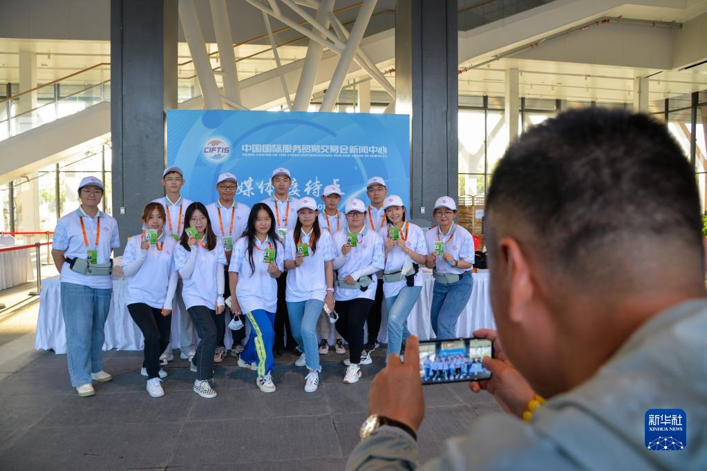 9月7日,志愿者在服贸会首钢园区拍照。新华社记者 徐钦 摄