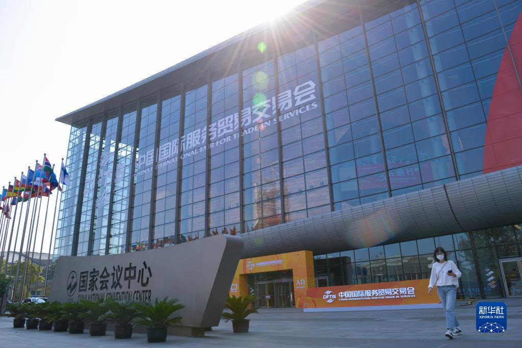 9月7日,一名女士走出服贸会国家会议中心展区。新华社记者 徐钦 摄