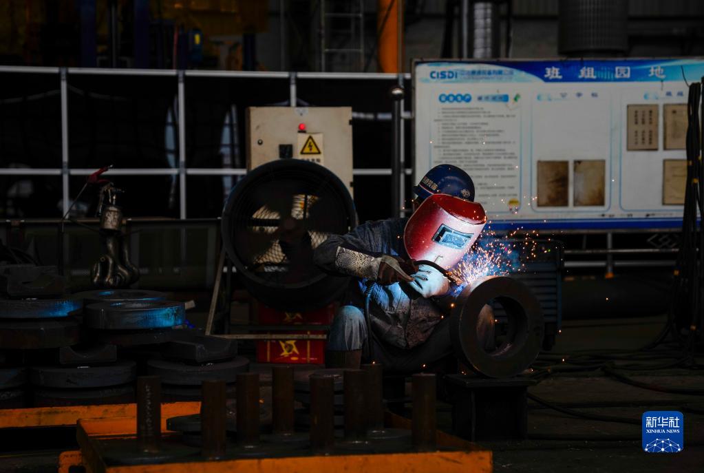 9月6日,中冶赛迪装备有限公司冶金装备生产车间内,一名工人在对国产冶金装备配件进行焊接作业。