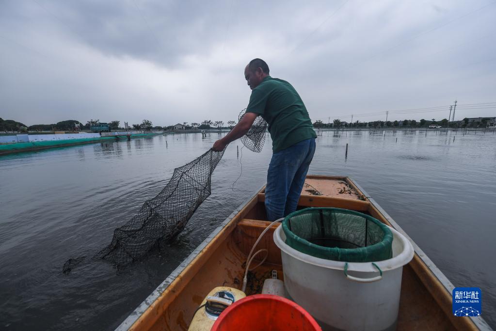 9月8日,在位于湖州市织里镇乔溇村的湖星生态农业发展有限公司的养殖基地内,工作人员在收虾笼里的罗氏沼虾。