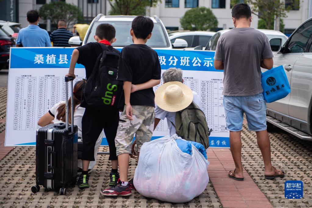 9月8日,在张家界市桑植县芙蓉学校,学生和家长查看分班公示。