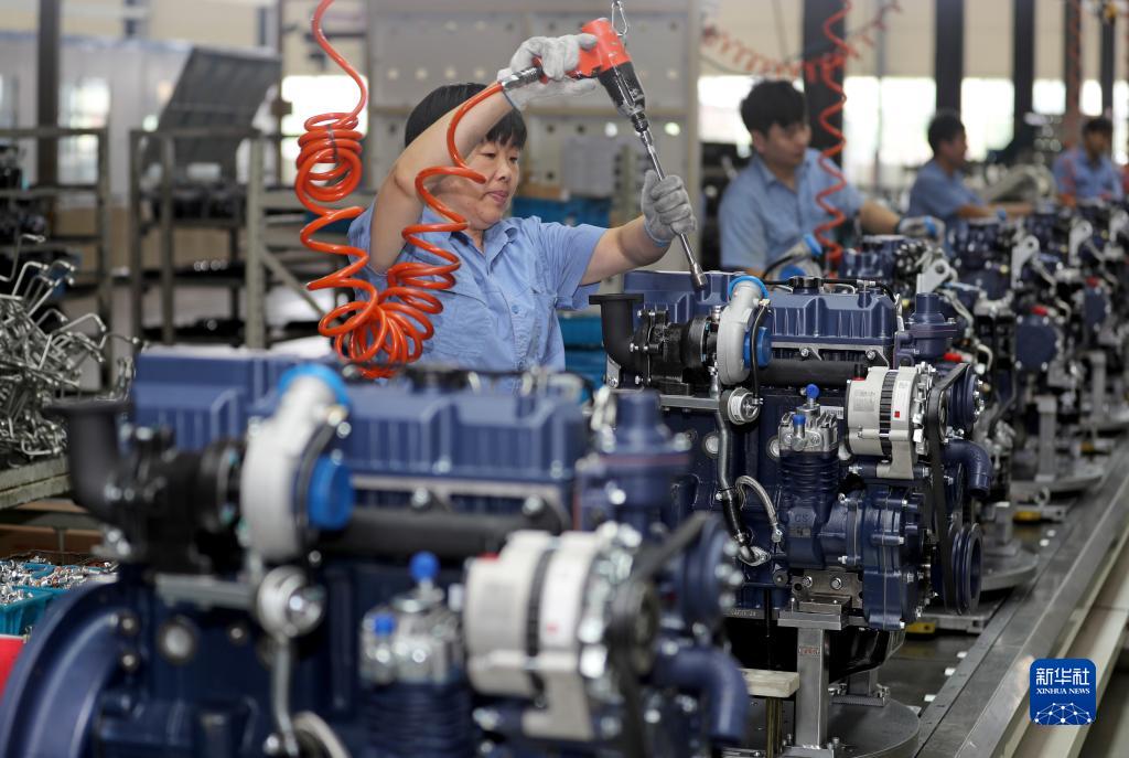 9月8日,在安徽全椒经济开发区,工人在一家装备制造企业装配工程机械柴油机。
