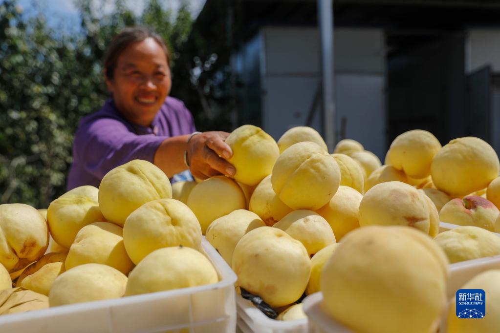近日,河南省宝丰县闹店镇种植的数百亩蟠桃、寿桃等特色品种鲜桃进入收获的季节,当地果农抢抓晴好天气采摘,并通过电商直播等形式,将鲜桃销往各地。近年来,该县因地制宜调整农业产业结构,鼓励引导农民发展特色种植,促进农业增效、农民增收。
