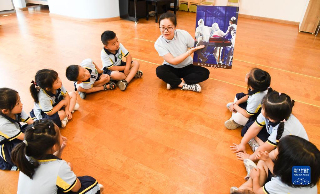 9月8日,济源市愚公路幼儿园的老师给小朋友们讲防疫知识。