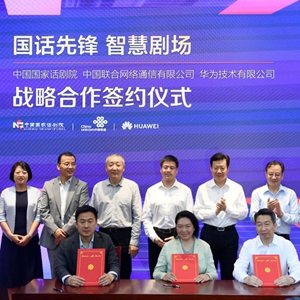 当日,中国国家话剧院、中国联合网络通信有限公司、华为技术有限公司战略合作签约暨5G智慧剧场联合实验室揭牌仪式在北京举行。三方将共同推进剧场通信基础设施建设与升级,提升剧场智慧化水平,促进线上演播与线下演出相结合,助力舞台艺术业态创新和剧场数字化升级。新华社记者 金良快 摄