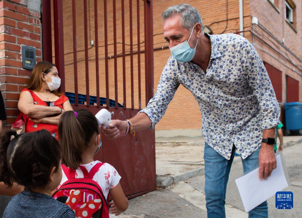 9月8日,一名老师在西班牙马德里一所学校外为学生测量体温。