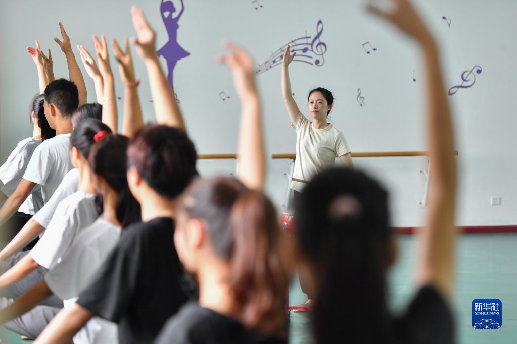 在长沙职业技术学院特殊教育学院的舞蹈房里,邓芸虹(后)带着学生练习基本功(9月7日摄)。