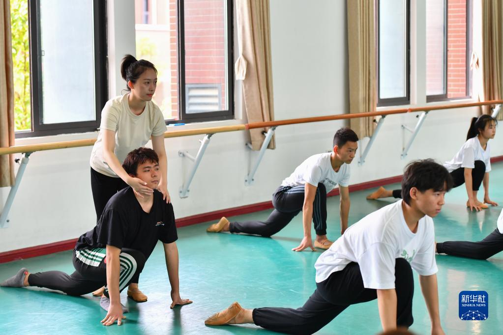 在长沙职业技术学院特殊教育学院的舞蹈房里,邓芸虹(左一)帮助学生矫正热身姿势(9月7日摄)。