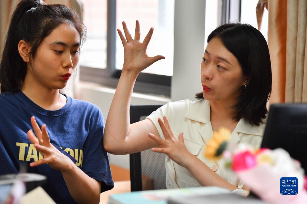 在长沙职业技术学院特殊教育学院,邓芸虹(右)在温习手语表达(9月7日摄)。