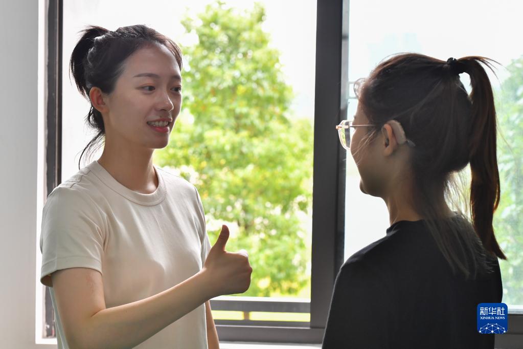 在长沙职业技术学院特殊教育学院的舞蹈房里,邓芸虹(左)用手语鼓励学生(9月7日摄)。