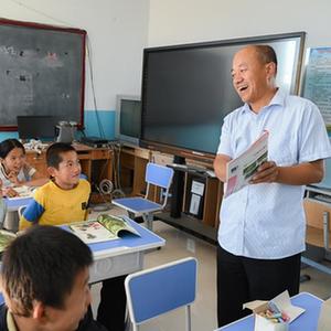 9月6日,杨建国给一年级和四年级的学生一起上课。