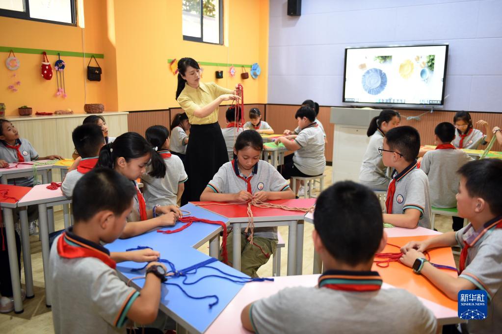 9月8日,在合肥市螺岗小学,赵勋(站立者)在“课后三点半”时间为编织社团的学生演示编织技巧。