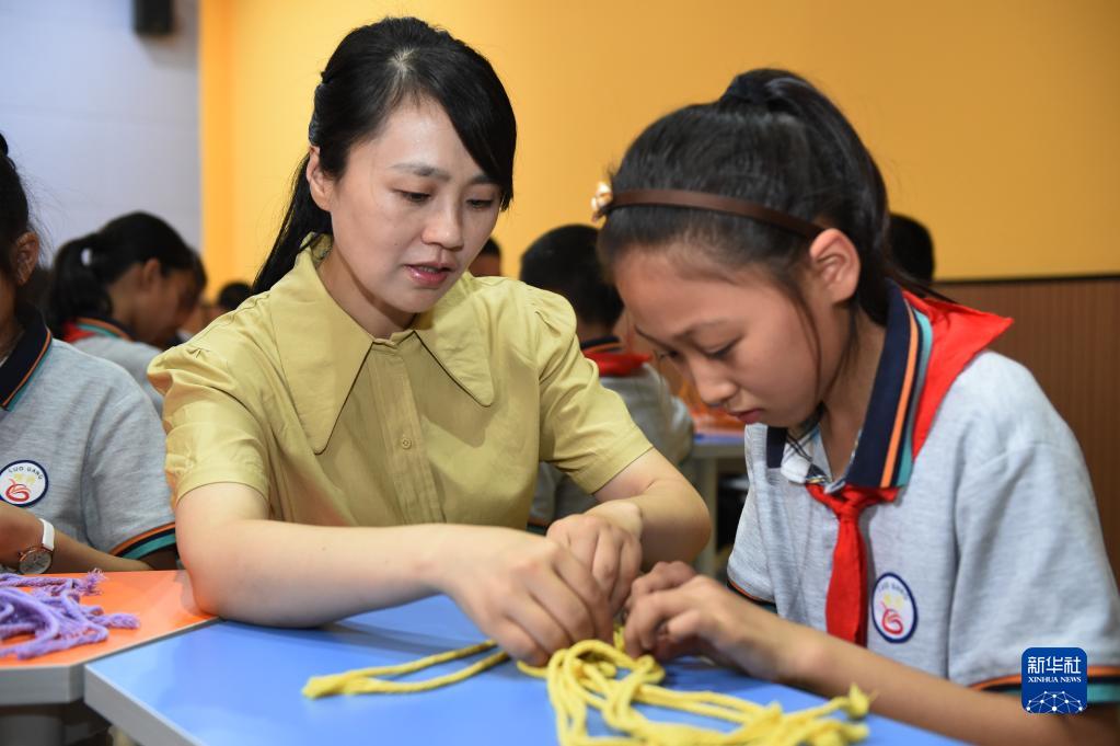 9月8日,在合肥市螺岗小学,赵勋(左)在“课后三点半”时间指导编织社团的学生。