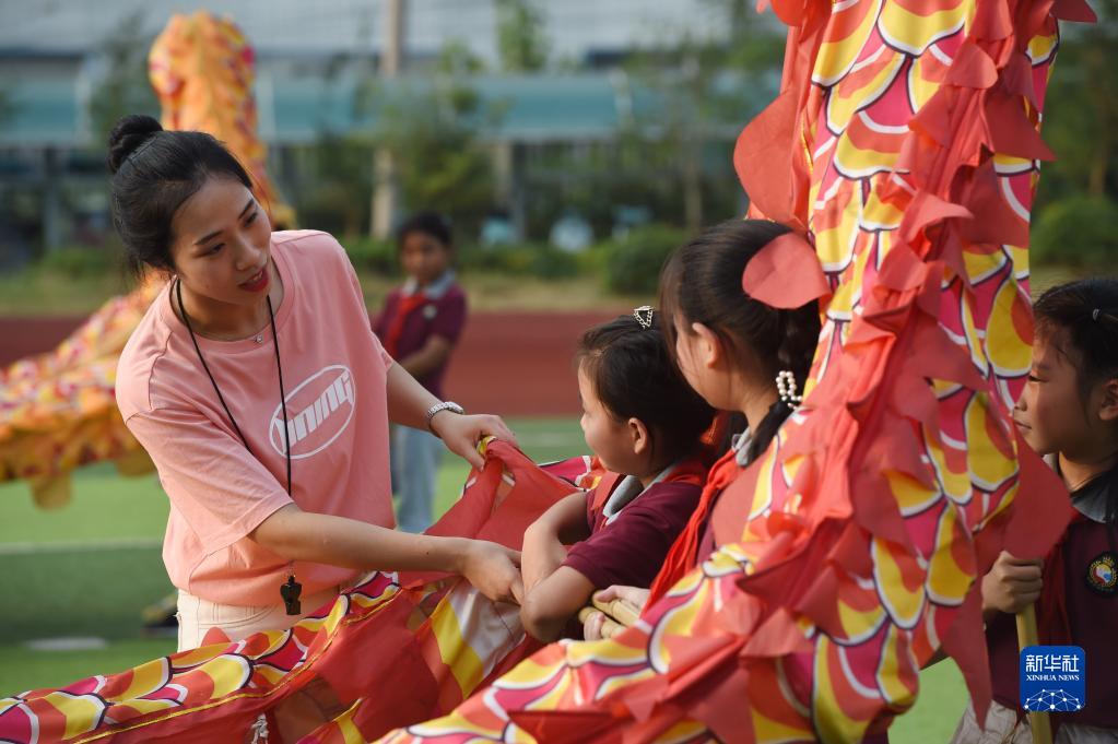 9月8日,在合肥市和平小学第三小学,王泠(左)在“课后三点半”时间指导醒狮舞龙社团的学生练习舞龙。