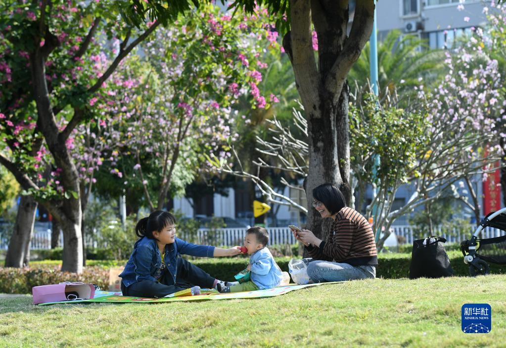 市民在广西南宁市南湖边草地上休闲(2月17日摄)。