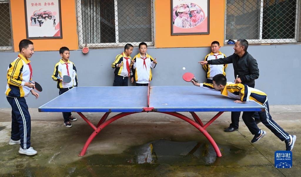 9月6日,在山西省晋城市阳城县次营镇中心学校,武爱国和学生一起打乒乓球。