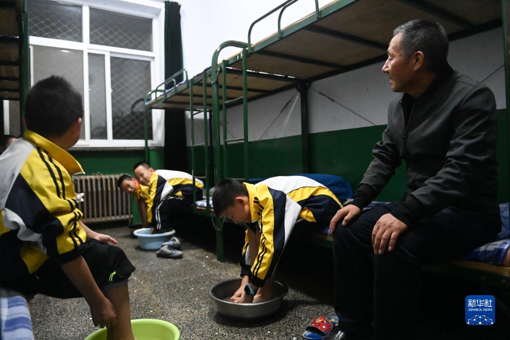 9月6日,在山西省晋城市阳城县次营镇中心学校,武爱国在宿舍督促孩子们洗脚。