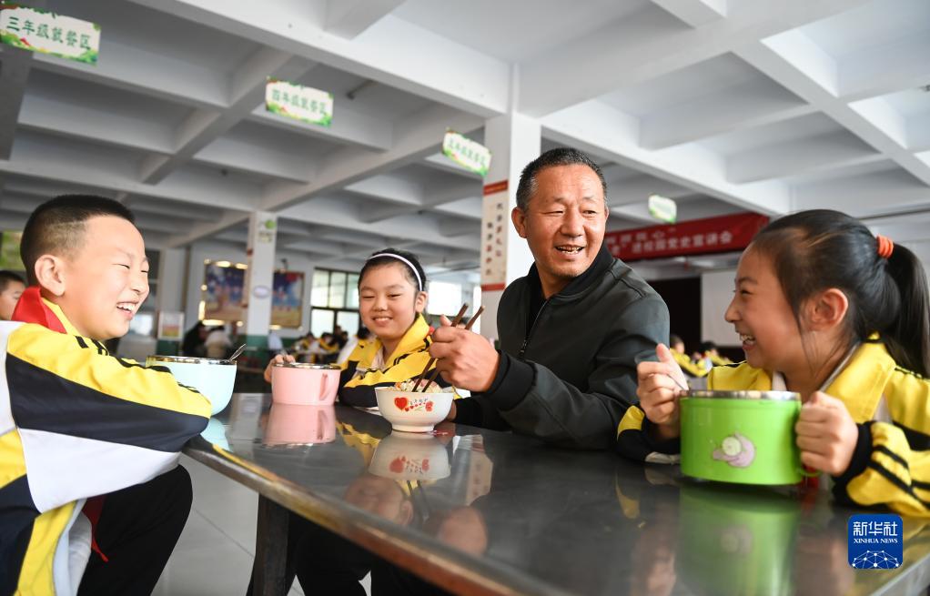 9月6日,在山西省晋城市阳城县次营镇中心学校,武爱国与孩子们一起吃午饭。