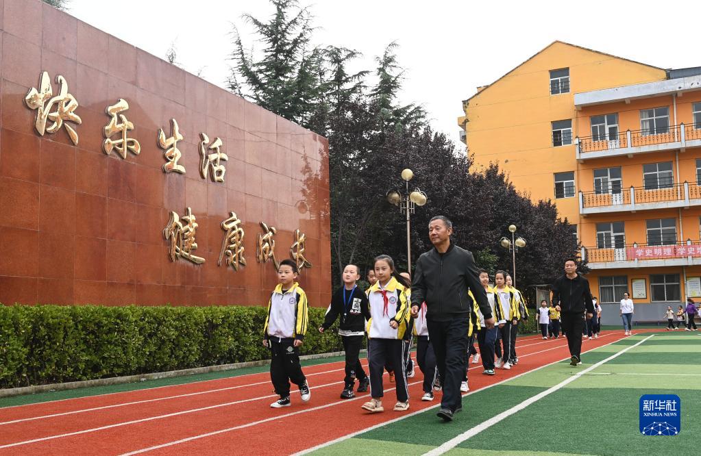 9月6日,在山西省晋城市阳城县次营镇中心学校,武爱国和学生一起运动。