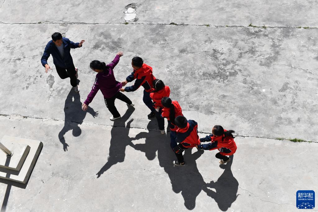 9月8日,在平顺县达驼村达驼教学点,宋忠胜(左一)和妻子李月梅及孩子们在操场上玩游戏。新华社记者 詹彦 摄