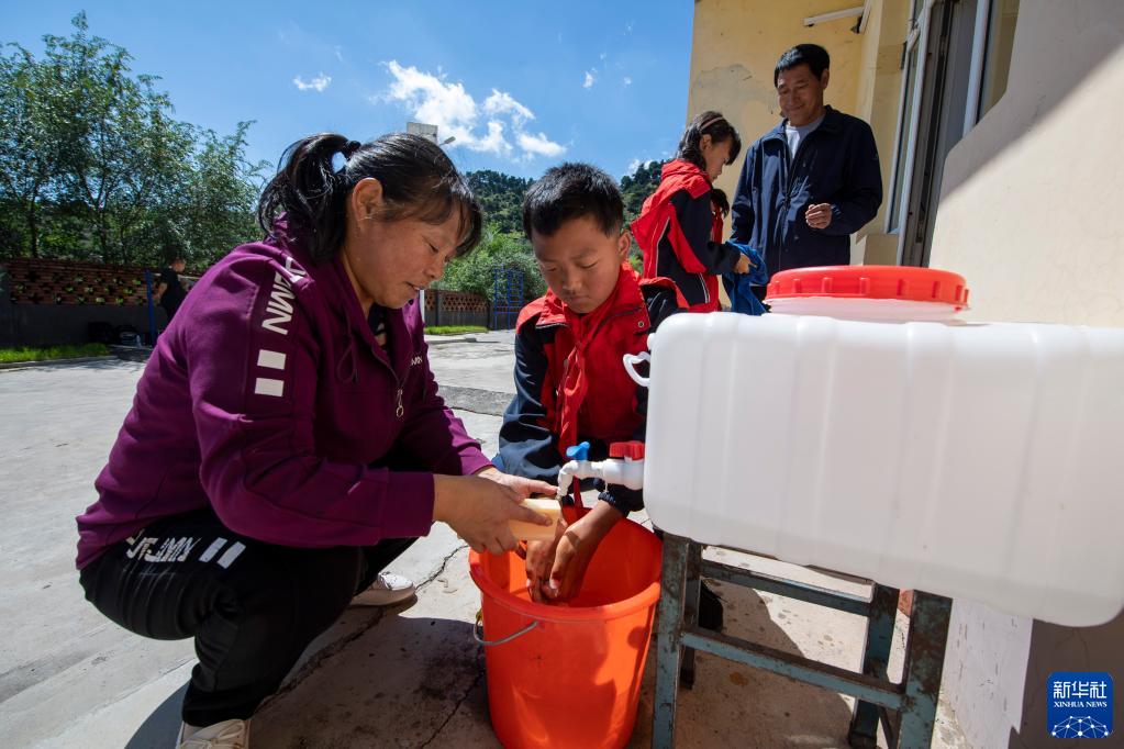 9月7日,在平顺县达驼村达驼教学点,李月梅(左一)在吃午饭前给学生洗手。新华社记者 杨晨光 摄