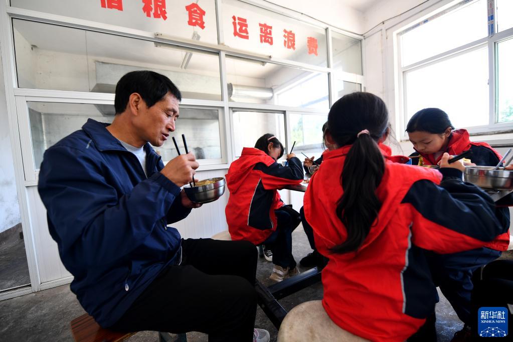 9月7日,在平顺县达驼村达驼教学点,宋忠胜(左一)和学生们一起吃午饭。新华社记者 詹彦 摄