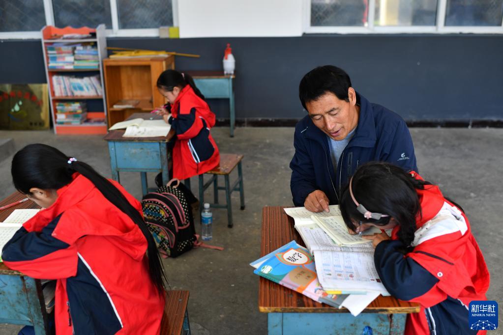 9月7日,在平顺县达驼村达驼教学点,宋忠胜在给学生辅导功课。新华社记者 詹彦 摄