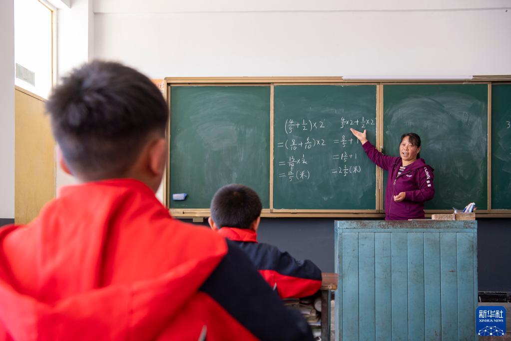 9月7日,在平顺县达驼村达驼教学点,李月梅(右)在给学生上数学课。新华社记者 杨晨光 摄