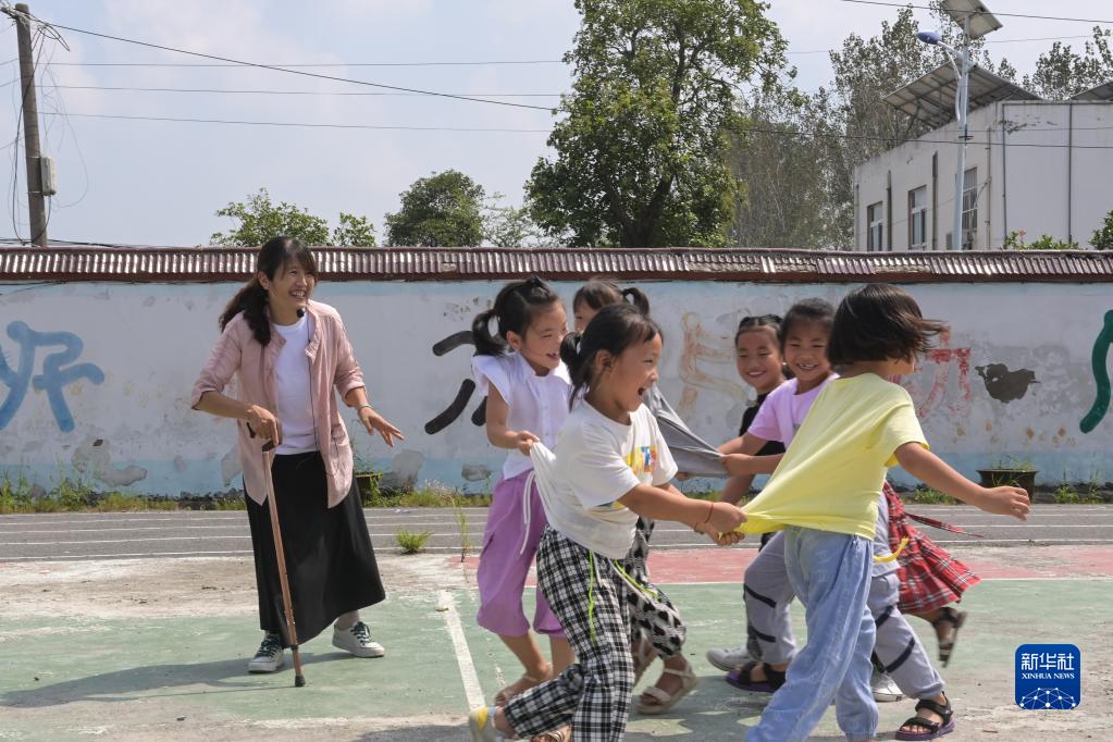 9月8日,李元芳带孩子们做游戏。