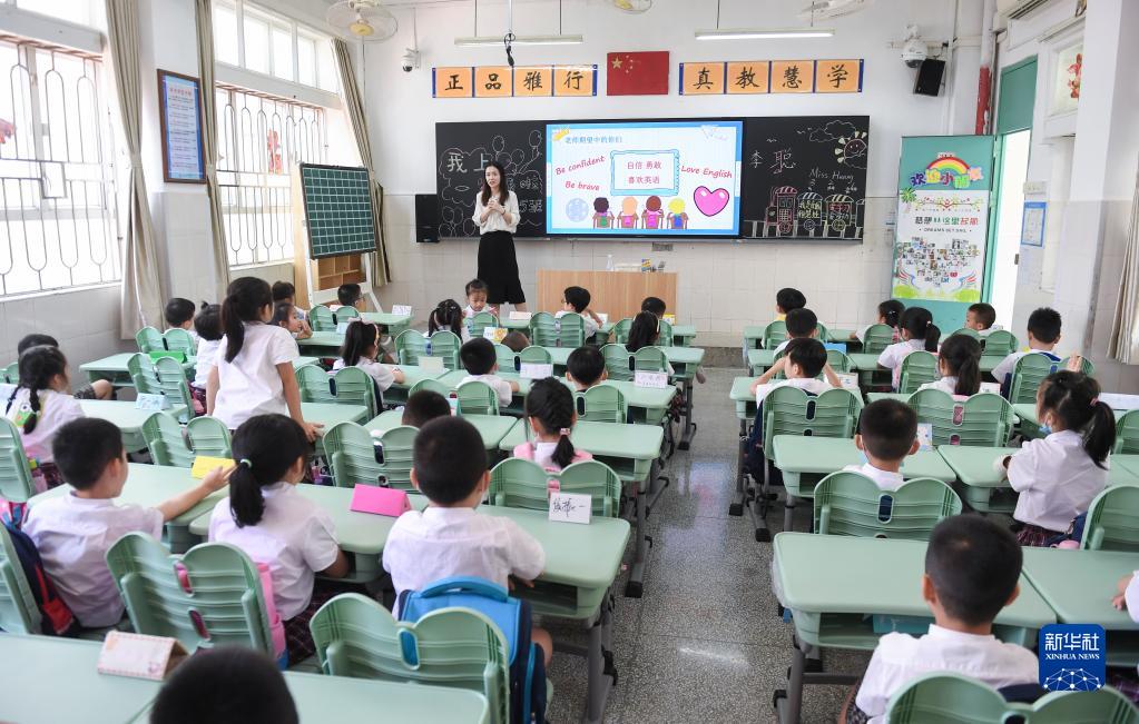 9月1日,在深圳市福田区南园小学一(15)班,黄晓蕾在英语课上授课。