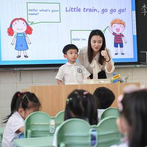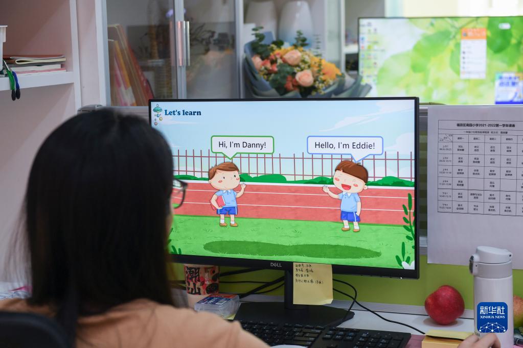 9月7日,在深圳市福田区南园小学教师办公室,黄晓蕾在备课时调整课件。