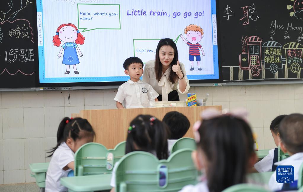9月1日,在深圳市福田区南园小学一(15)班,黄晓蕾在英语课上鼓励孩子用英语自我介绍。
