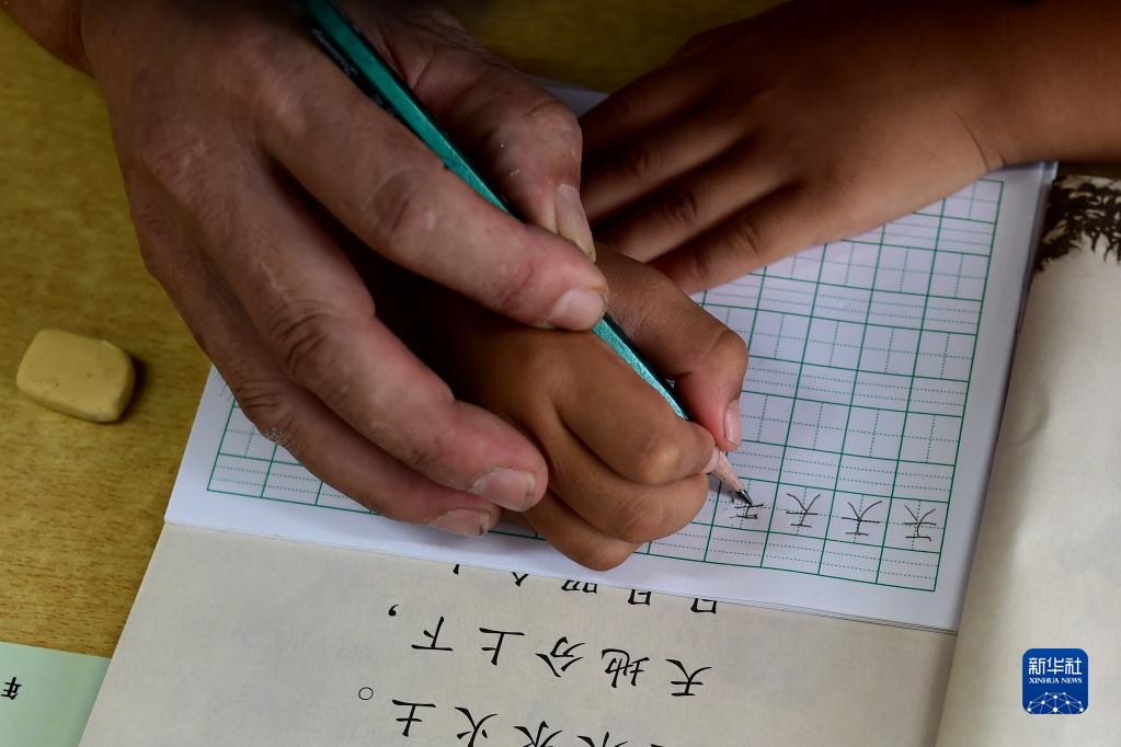 在菥荻教学点,许新民教一年级学生朱心怡写字(9月1日摄)。