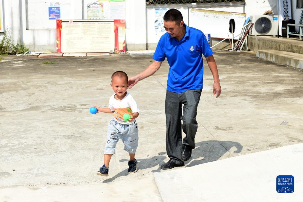 在菥荻教学点,许新民和学前班学生朱元浩做游戏(9月1日摄)。